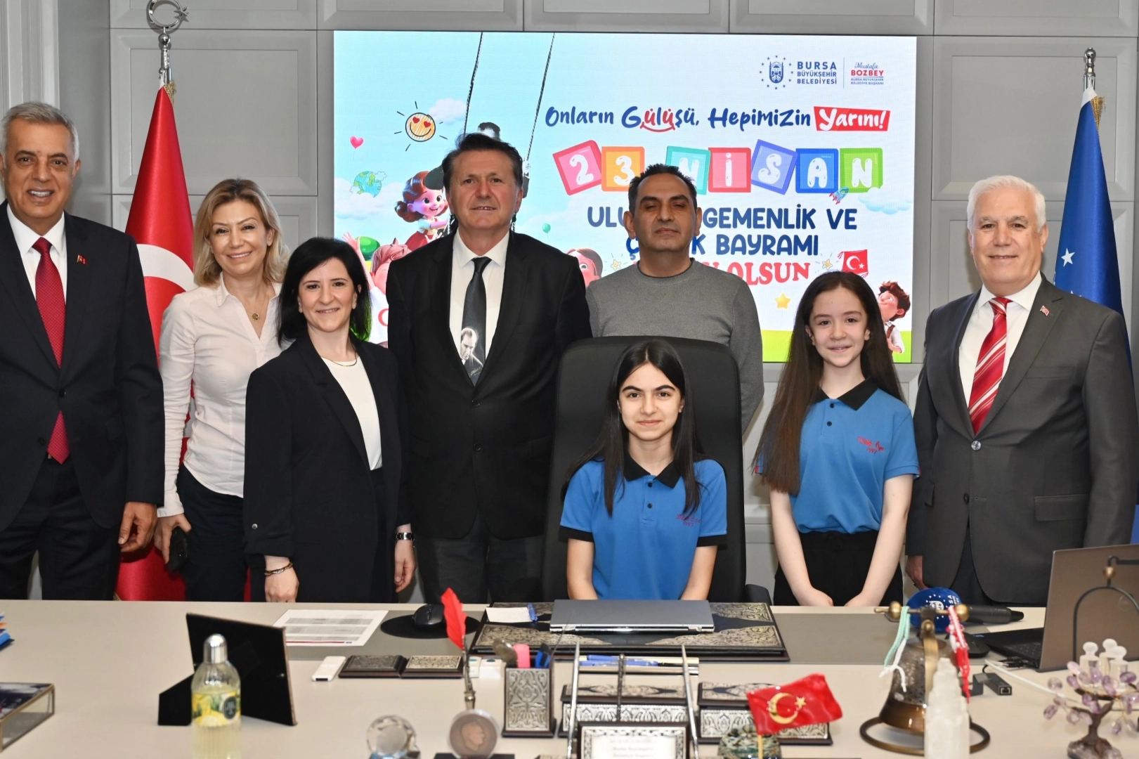 Bursa Büyükşehir Belediye Başkanı Mustafa Bozbey de koltuğunu Dilek Özer Ortaokulu 7. sınıf öğrencileri Duru Tuna ve İlke Ormancı’ya devretti.