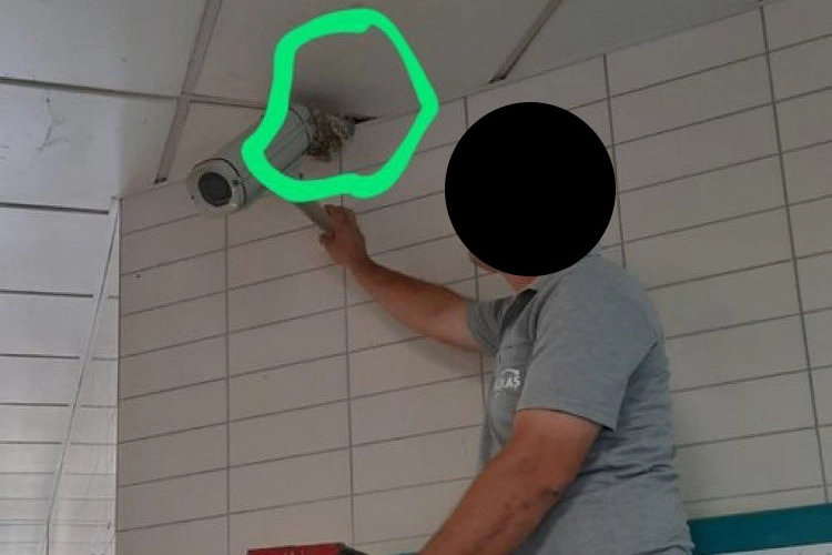 Vatandaşın paylaştığı görüntülerde, bir temizlik görevlisi güvenlik kamerasının arkasına yapılan kuş yuvasının yanında spatulayla görülüyor.