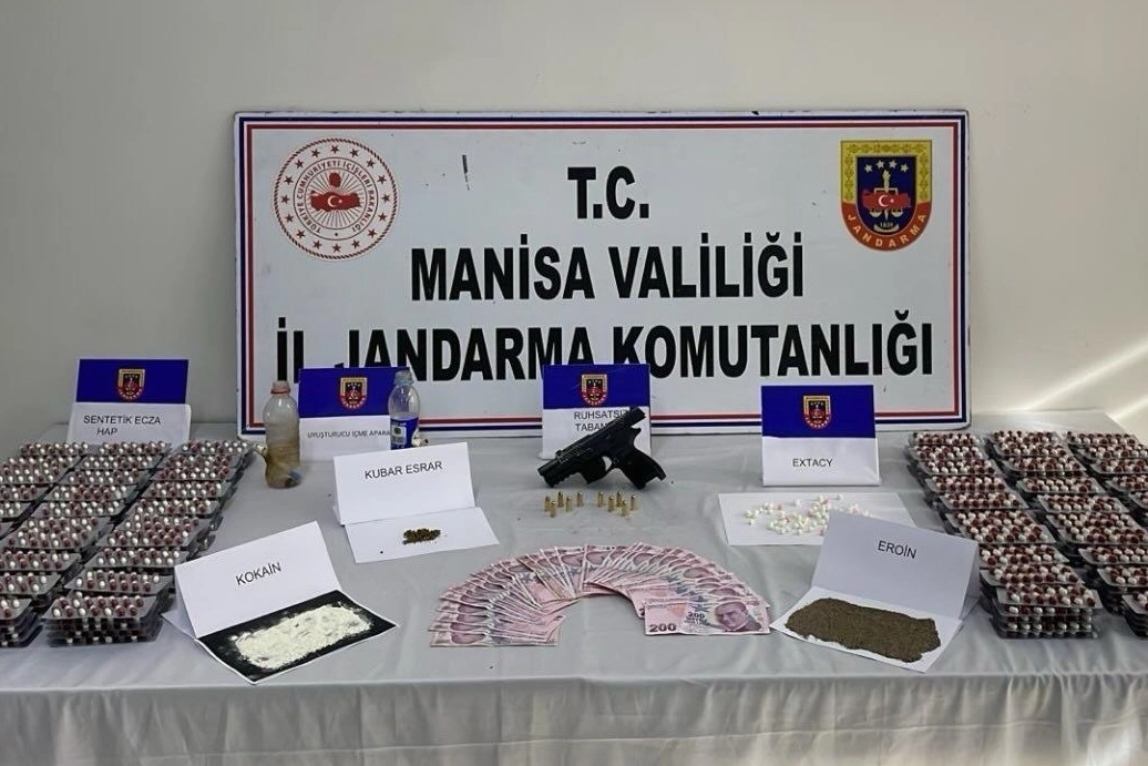 Manisa'nın Akhisar ilçesinde, Akhisar İlçe Jandarma Komutanlığınca M.Y., G.S., R.I., E.E. ve A.İ.'ye ait 3 adres ile şahısların üzerlerinde yapılan aramalarda; 3 bin 851 adet sentetik ecza hapı, 3 adet uyuşturucu kullanma aparatı, 27.25 gram yüksek düzeyli uyuşturucu, 1 adet ruhsatsız av tüfeği, 1 adet ruhsatsız tabanca, 10 adet tabanca mermisi, 6 bin 360 TL suçtan elde edildiği değerlendirilen para ele geçirildi.
