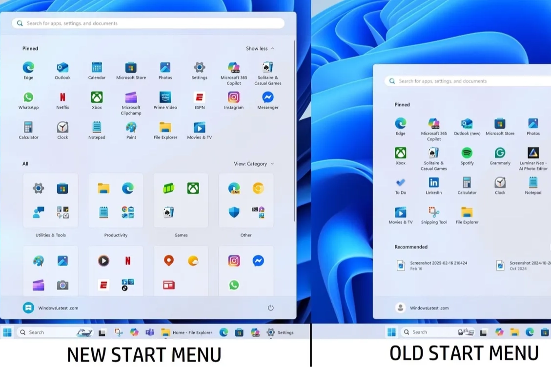 Windows 11'in 24H2 ya da 25H2 güncellemesiyle sunulması beklenen bu özellik, ilk kez X platformunda Phantom adlı kullanıcı tarafından fark edildi. Phantom, yeni başlat menüsü tasarımının (soldaki) ekran görüntülerini de paylaştı: