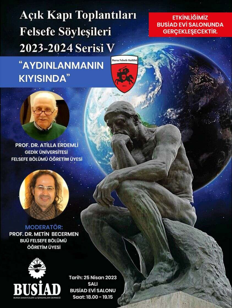 Prof.Dr. Atilla Erdemli bugün BUSİAD’ın Açık Kapı/Felsefe Söyleşileri’nin konuğu olacak. “Aydınlanmanın Kıyısında” konusuyla Gedik Üniversitesi Felsefe Bölümü Öğretim Üyesi Prof. Dr. Atilla Erdemli’nin konuşmacı olduğu18.00’deki toplantıda Bursa Uludağ Üniversitesi Felsefe Bölümü Öğretim Üyesi Prof. Dr. Metin Becermen moderatörlük yapacak.