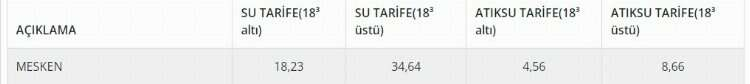 18 metreküp üstü suyun fiyatı ise 34,64 TL, 18 metreküp üstü atık su bedeli 8,66 TL.