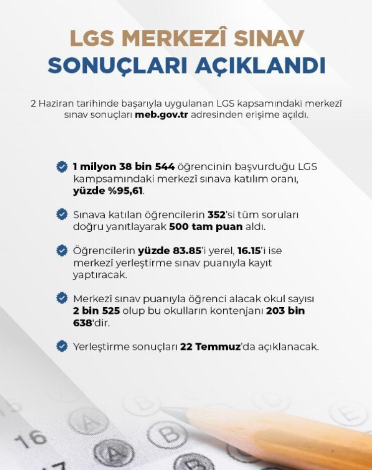 Milli Eğitim Bakanlığı tarafından paylaşılan LGS 2024 istatistiklerine göre sınava katılan 352 öğrenci tüm soruları doğru yanıtlayarak 500 tam puan aldı.