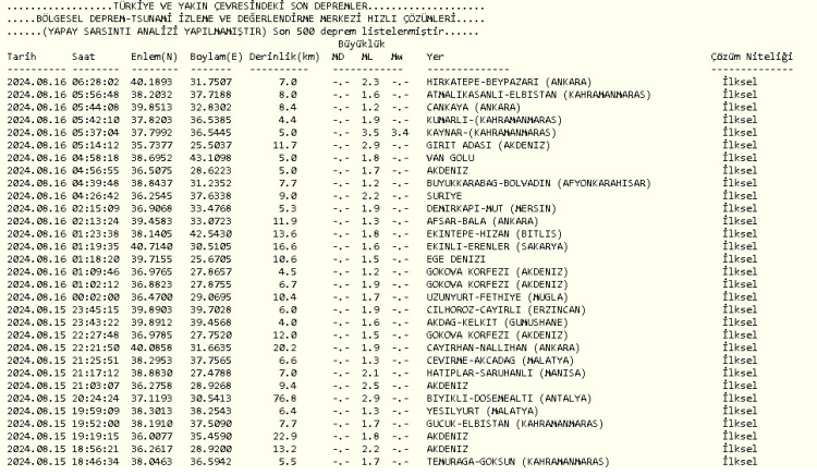 İŞTE BURSA'DAKİ SON DEPREMLERİN LİSTESİ... (16 Ağustos 2024)