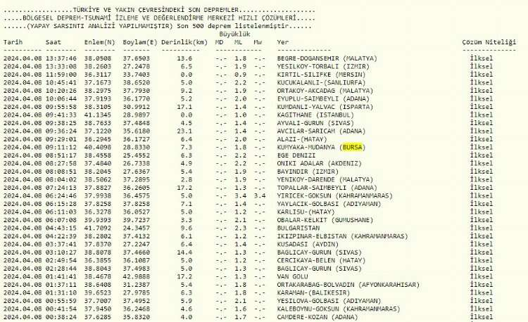 İŞTE BURSA'DAKİ SON DEPREMLERİN LİSTESİ... (8 NİSAN 2024)