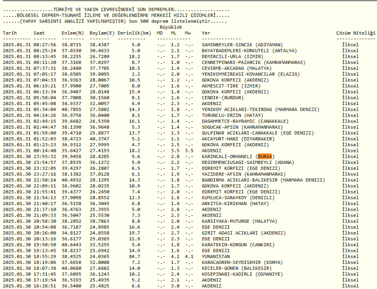 İŞTE BURSA'DAKİ SON DEPREMLERİN LİSTESİ... (31 Ocak 2025)