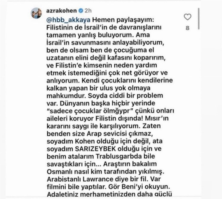 Yahudi kökenli Sadok Kohen ile evli olduğu bilinen yazar Azra Kohen, Gazze'de yaşananlardan sonra, Refah konusunda paylaşım yapmamasını eleştiren bir takipçisine verdiği yanıtta İsrail'e açık desteğini ortaya koydu. "Çocuklarını bombaların atılacağı yerlere bilerek götürüyorlar" Filistinlilerin çocuklarını, '3 saat önceden uyarılar yapılmasına rağmen bombaların atılacağı yerlere bilerek götürdüğünü' söyleyen Kohen, "Yavrusunu korumayan yem eden hiçbir kimse yaşamı hak etmiyor " dedi.