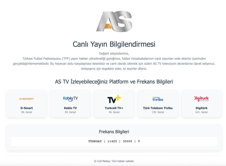 Kanaldan yapılan açıklamada, "Değerli izleyicilerimiz, TFF yayın hakları gereği futbol müsabakalarının canlı yayınları web sitemizden verilememektedir. Karşılaşmayı kesintisiz ve canlı izlemek için sizleri AS TV ekranlarına davet ediyoruz." ifadeleri kullanıldı.