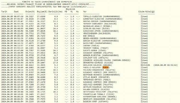 İŞTE BURSA'DAKİ SON DEPREMLERİN LİSTESİ... (9 NİSAN 2024)