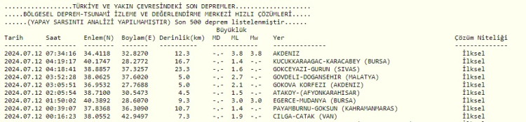 İŞTE BURSA'DAKİ SON DEPREMLERİN LİSTESİ... (12 Temmuz 2024)