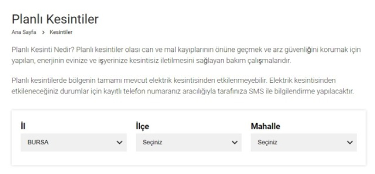 Bursa elektrik kesintileri için UEDAŞ elektrik arıza ve kesinti listesinin yayınlandığı BURSA ELEKTRİK KESİNTİSİ'ne tıklayıp, bulunduğunuz ilçe, mahalle ve sokağı seçerek bölgenizdeki elektrik kesintileri hakkında bilgi sahibi olabilirsiniz.