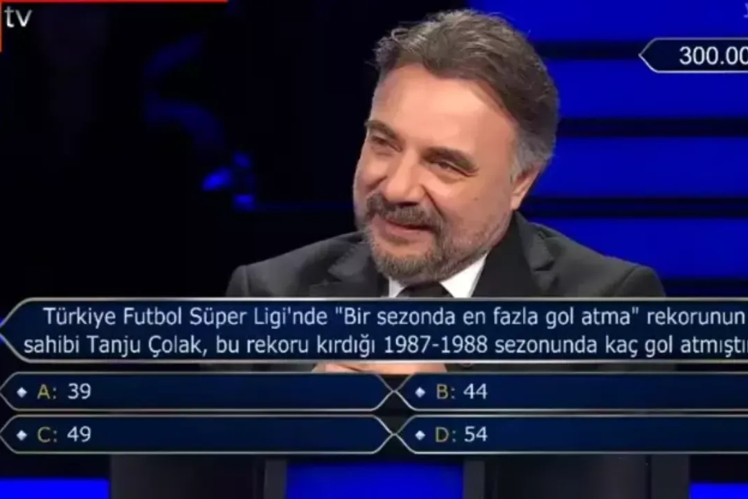 Kim Milyoner Olmak İster’de “Türkiye Futbol Süper Ligi'nde ''Bir sezonda en fazla gol atma'' rekorunun sahibi Tanju Çolak, bu rekoru kırdığı 1987 - 1988 sezonunda kaç gol atmıştır?” sorusu soruldu.