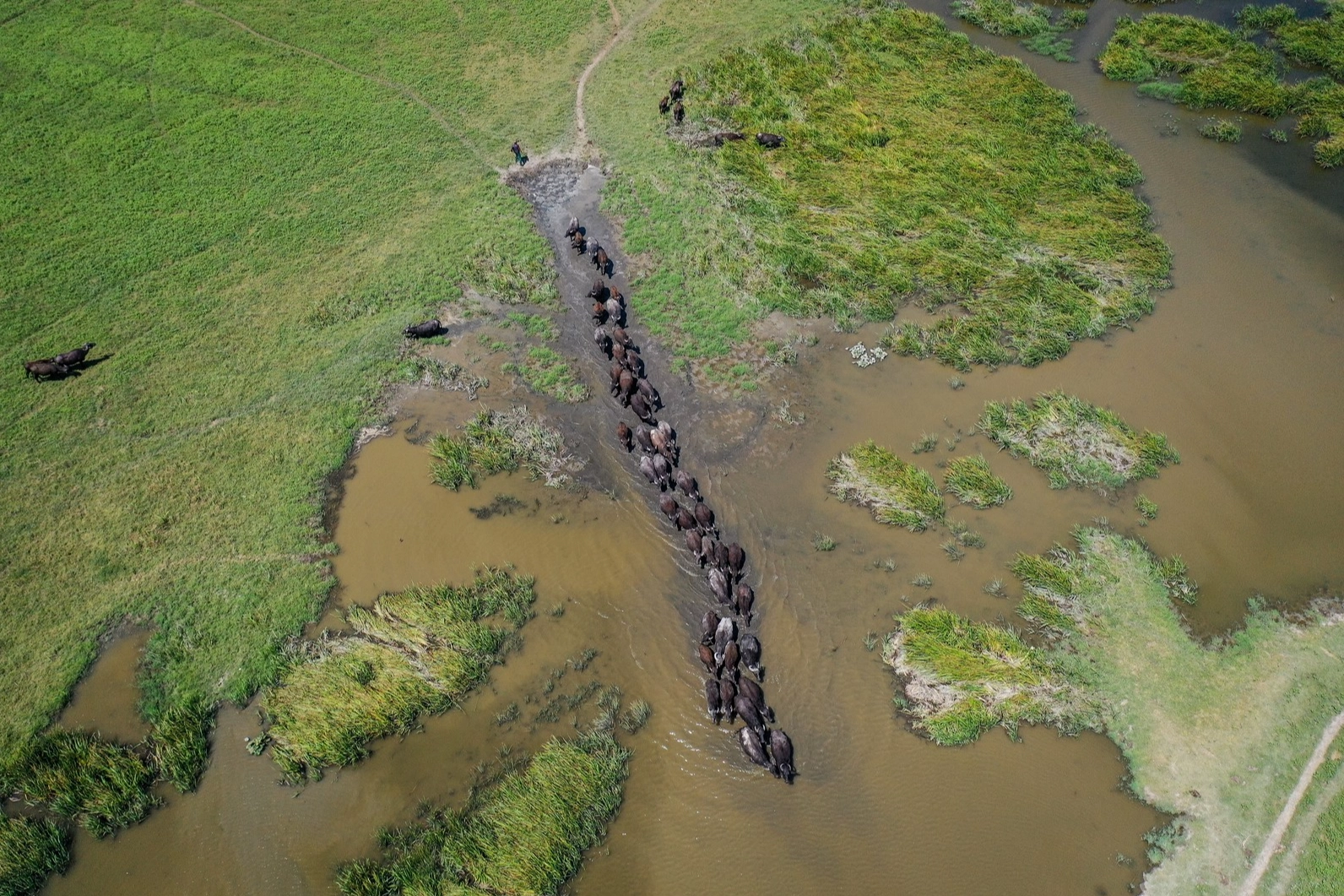 Mandaların sürü halinde suya girip, Afrika savanalarındaki (tropikal iklim bölgesine özgü bitki örtüsü, Ekvator kuşağındaki otsu bitkilerle kaplı çayırlar) bufalo sürülerini andırdığı anlar, dronla kaydedildi.