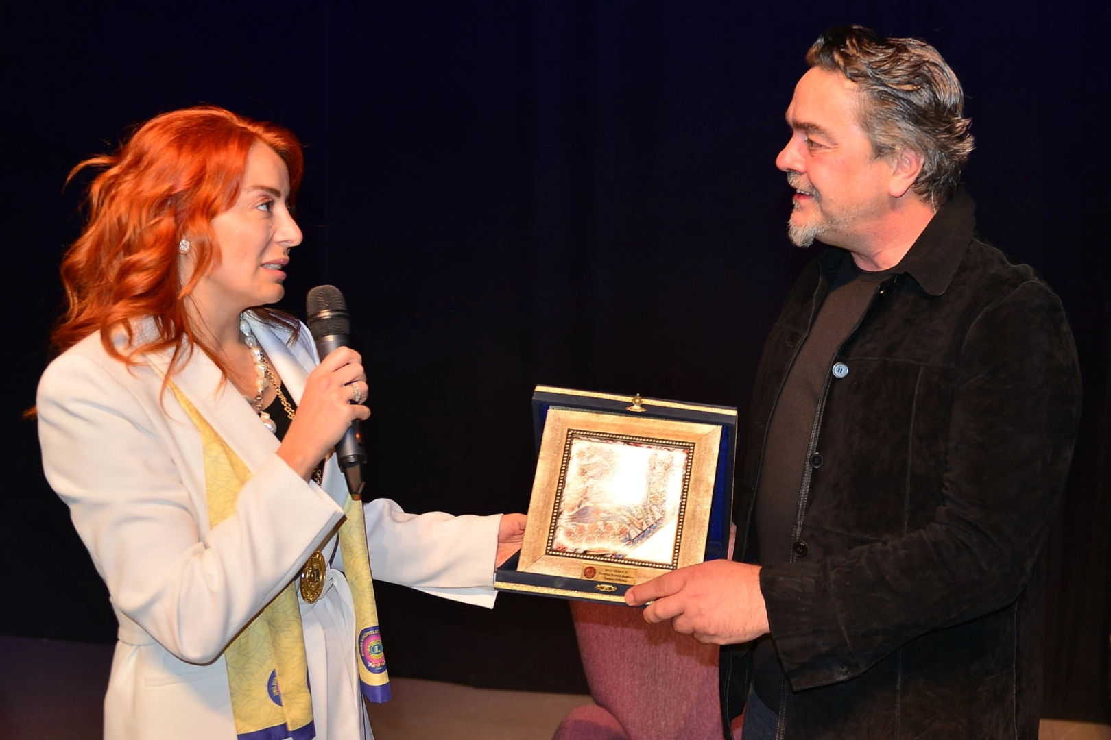 Kükürtlü Lions Kulübü Başkanı Özleyiş Ardalı da Beyaz’a bir anı plaketi sundu.