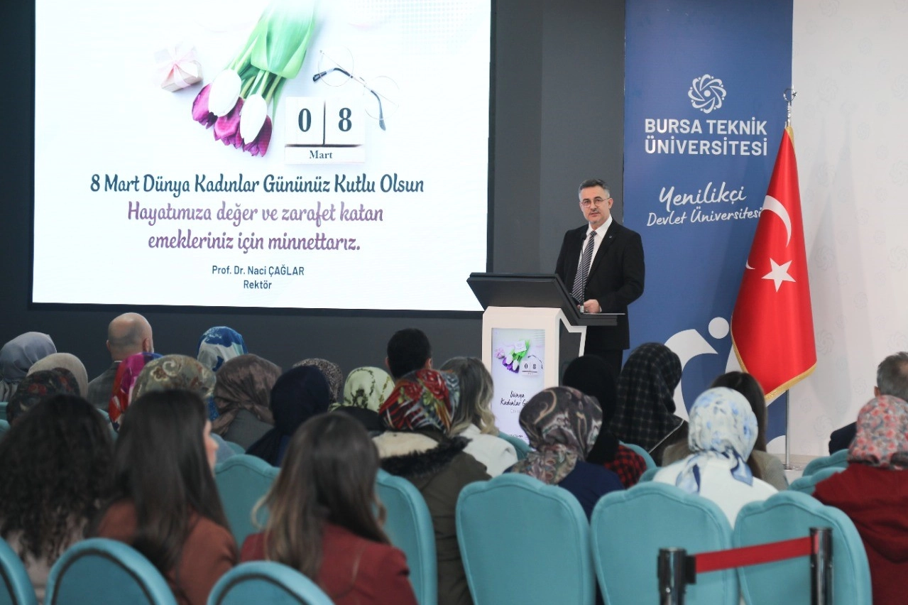 Kadın ve Aile Koordinatörü Dr. Öğretim Üyesi Elif Vurucular Kesimci ise konuşmasında, 8 Mart’ın yalnızca bir kutlama günü değil tarihî bir mücadelenin ve eşitlik talebinin simgesi olduğunu vurguladı. Kadınların eğitimde, bilimde, kamusal yaşamda ve çalışma hayatında görünürlük kazanmasının uzun soluklu ve kararlı bir mücadelenin sonucu olduğunu belirten Dr. Kesimci, üniversitelerin bu dönüşümün en önemli mekânlarından biri olduğunu ifade etti. Dr. Elif Vurucular Kesimci, üniversitelerin bilgi ve değer üreten, toplumsal değişimi yönlendiren kurumlar olduğunu belirterek, BTÜ’de görev yapan kadın akademisyenlerin bilime katkı sunduğunu, idari personelin ise kurum kültürünü güçlendirdiğini söyledi.