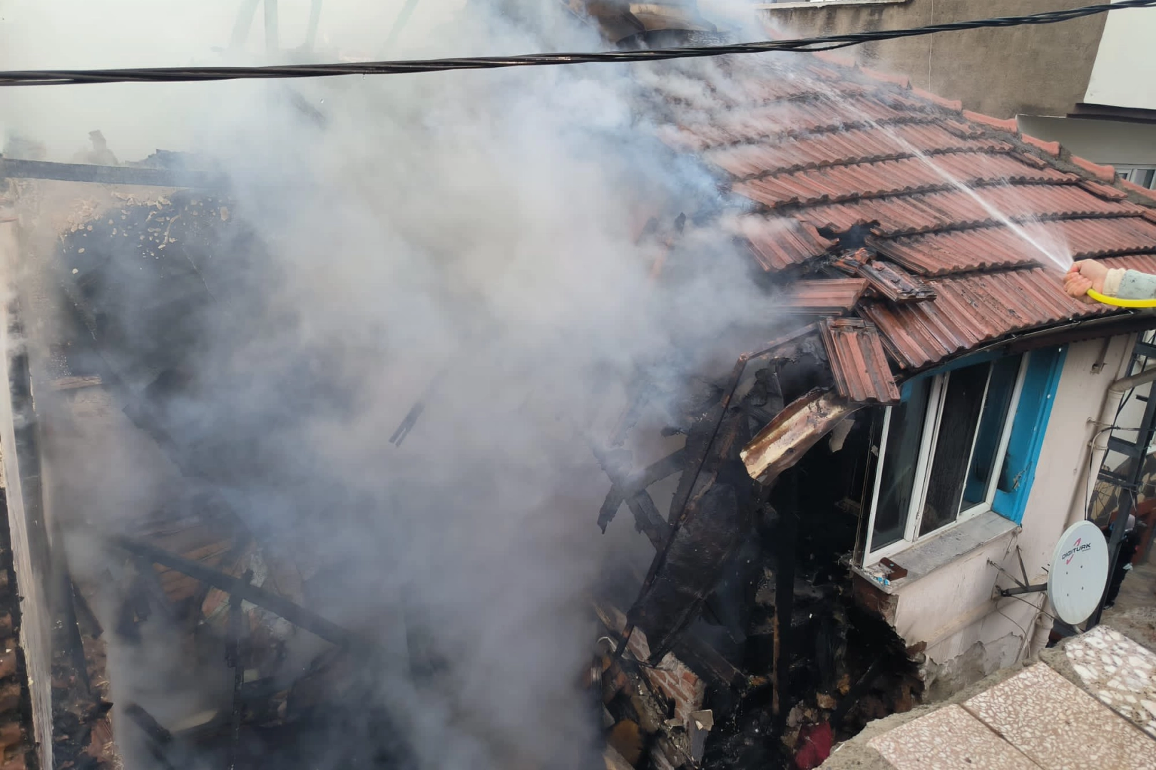 Alevlerin teslim aldığı ev çökerken, 1,5 yaşındaki oğlu Egemen E.'yi kurtarmak isteyen anne, itfaiye ekiplerince evden çıkarıldı.