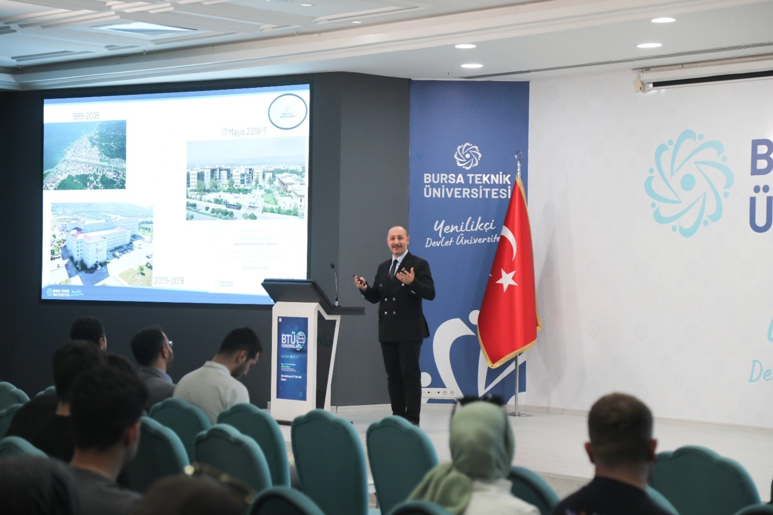 Mimar Sinan Yerleşkesi Turkuaz Salon’da her hafta çarşamba günü düzenlenen BTÜ Konuşmaları’nın 4’ncü sezon 38’nci bölüm konuğu, BTÜ Mühendislik ve Doğa Bilimleri Fakültesi Gıda Mühendisliği Bölümü Öğretim Üyesi ve TÜBA Genç Bilim İnsanı Ödülü Sahibi Doç. Dr. Furkan Türker Sarıcaoğlu oldu. Gıda bilimi alanında yaptığı çalışmalarla, "Üstün Başarılı Genç Bilim İnsanı Ödülü"ne layık görülerek, 18 Aralık 2024’de düzenlenen törenle, Cumhurbaşkanı Recep Tayyip Erdoğan tarafından ödülü takdim edilen Doç. Dr. Furkan Türker Sarıcaoğlu’nun konuk olduğu programa; BTÜ Rektör Yardımcısı Prof. Dr. Barış Tamer Tonguç, akademisyenler ve öğrenciler katıldı. "Akademisyenlik Yolunda Başarı" başlıklı konuşmasını yapan Doç. Dr. Furkan Türker Sarıcaoğlu, akademik kariyerinde izlediği yolu anlatarak öğrencilere tavsiyelerde bulundu. Bilimsel çalışmanın bir ekip işi olduğunu vurgulayan Doç. Dr. Sarıcaoğlu, ekibin birbirini tamamlamasının ise çok kritik olduğunun altını çizdi. Bu kapsamda akademik çalışmalarının yanında Bursateknopark’ta kurduğu "Sarıcaoğlu Research Group" çatısı altında gıda bilimi alanına yönelik çalışmaları sürdürdüğünü dile getiren Doç. Dr. Sarıcaoğlu, buradaki başarılarının temelinde iyi ekip arkadaşlarının olduğunu söyledi.