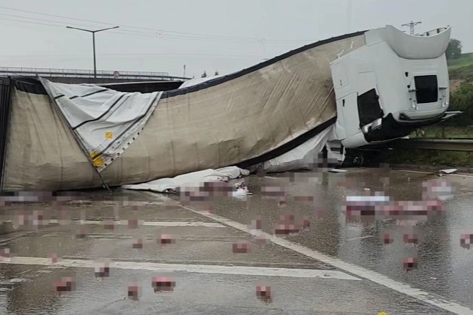 Bursa istikametine seyir halinde olan H.B idaresindeki tır, yağış etkisiyle kayganlaşan yolda sürücünün kontrolünden çıkarak önce bariyere çarptı ardından yola devrildi.
