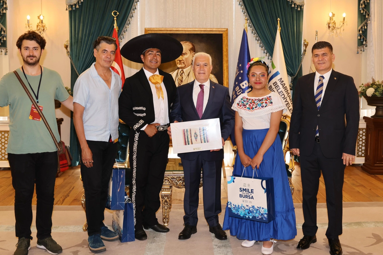 Bursa Büyükşehir Belediyesi adına Bursa Kültür Sanat ve Turizm Vakfı (BKSTV) tarafından düzenlenen 37. Uluslararası Altın Karagöz Halk Dansları Yarışması'na katılan ülkelerin temsilcileri ve yarışmanın jüri üyeleri, Bursa Büyükşehir Belediye Başkanı Mustafa Bozbey’i Tarihi Belediye Binası’nda ziyaret etti.