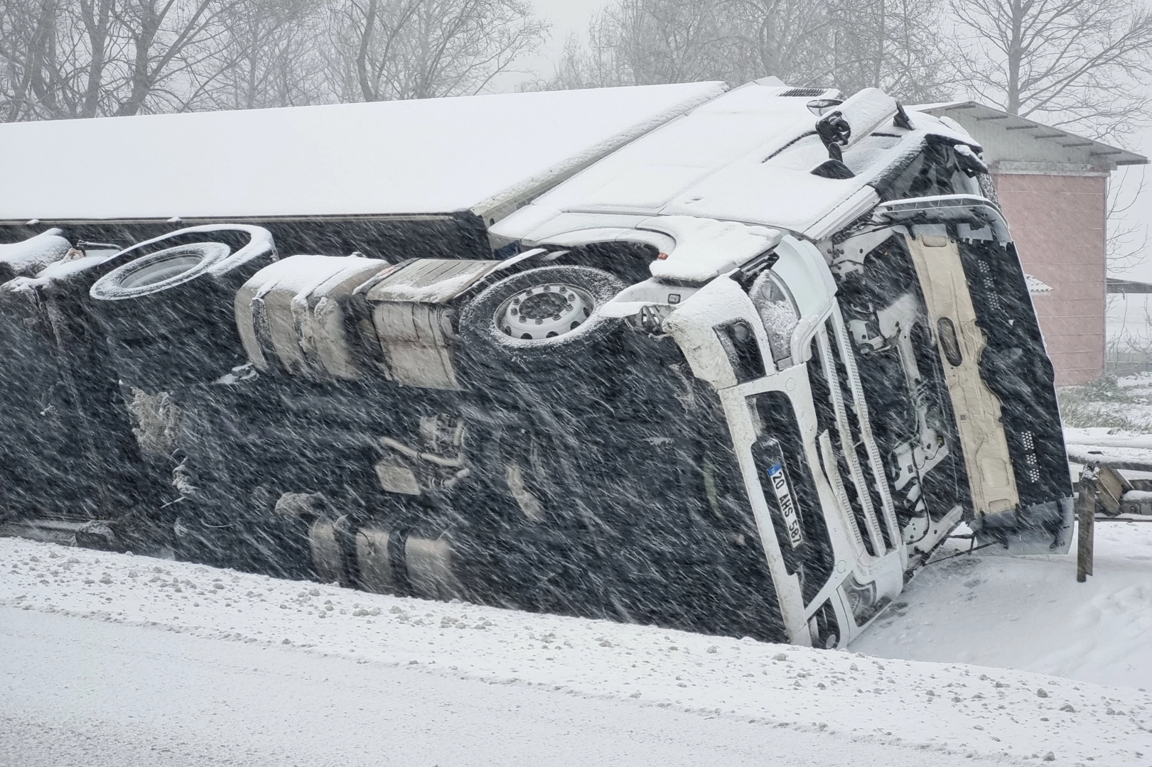 Karacabey ilçesi Uluabat mevkiinde de yoğun kar yağışı sebebiyle Bursa - İzmir Yolunun bir bölümü karla kaplanınca Bursa istikametinden Karacabey istikametine seyreden 20 AHS 587 plakalı tır karda kayıp orta refüje düştü.