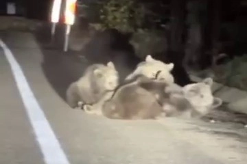 Görüntülerde, yolun kenarına yatarak 3 yavrusunu sakin bir şekilde emziren anne ayının son derece koruyucu tavırlar sergilediği dikkat çekti.