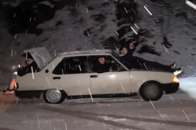 Yazlık lastikle kar sevinci yaşamak isteyen bir sürücü ise, yolcuları aracın kaputuna ve bagajında oturarak yokuş yukarı çıkmaya çalıştı. O anlar amatör kameraya yansıdı.