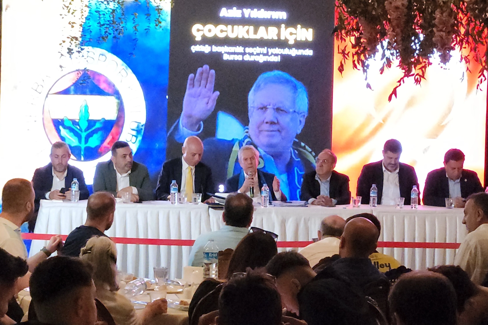Nilüfer Organize Sanayi Bölgesi'ndeki (NOSAB) yemekli toplantıya yönetim listesinde yer alan Nihat Özbağ ve Ömer Onan ile birlikte katılan Aziz Yıldırım, Bursalı kongre üyelerinden destek istedi. Sarı-lacivertli dernek üyelerinin yoğun ilgi gösterdiği Yıldırım, kendisine yöneltilen soruları açık yüreklilikle cevaplandırdı.