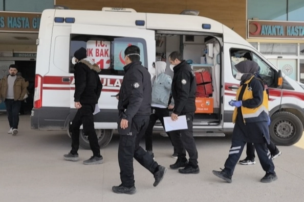 Ekipler, koruyucu maskeler takarak, 2 şüpheliyi ambulansa aldı.