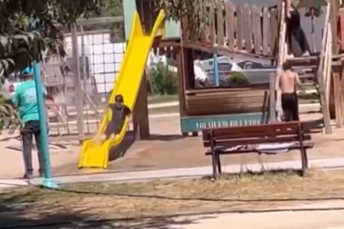 Nilüfer ilçesinde bir parktaki çimleri sulayan belediye temizlik görevlisi, sıcağa rağmen parkta oynayan çocukları görünce, onları serinletmek için elindeki hortumla su sıktı.