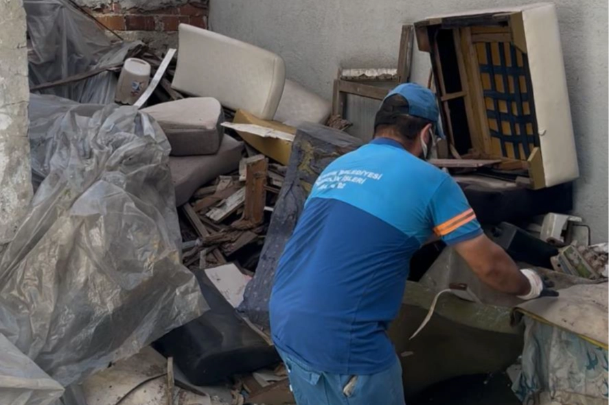 Uzun süredir çevreye rahatsızlık veren kokuların kaynağı olduğu öğrenilen evde Yıldırım Belediyesi ekiplerince yapılan temizlik çalışmasında, kapıdan adım atacak yer kalmayacak şekilde yığılmış çöpler olduğu görüldü.