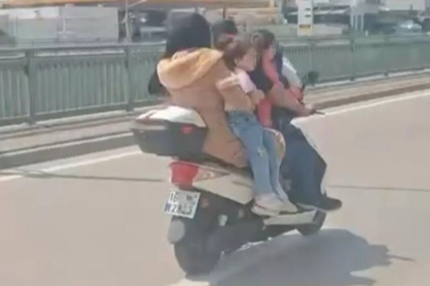 Motosikletin sürücüsü kask takmazken, arkasındaki ve önündeki aile üyelerinin de herhangi bir koruyucu ekipman kullanmadığı görüldü.