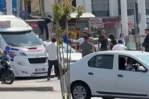 Yol verme tartışması yüzünden yolun ortasında araçlarını park eden sürücüler, yumruk yumruğa kavgaya tutuştu.