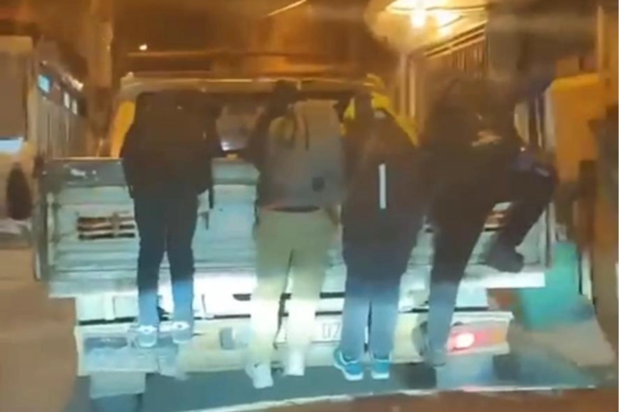 Bursa’nın Osmangazi ilçesi Merinos Mahallesi üzerinde açık kasa bir kamyoneti gören çocuklar, aracın kasasına tutundu.
