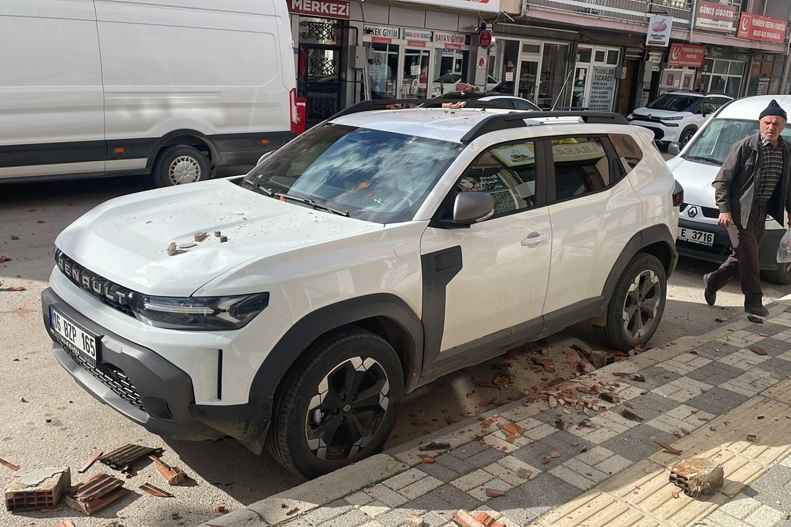 Bacadan kopan beton ve tuğla parçalar evin önünde yol üzerinde park halinde bulunan 16 BZP 165 plakalı otomobilin üzerine düştü.