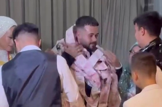 Beyda ve Enes çiftinin mutlu gününde takı merasiminde salona getirilen metrelerce uzayan para şeridi davetlilerin dikkatini çekti.