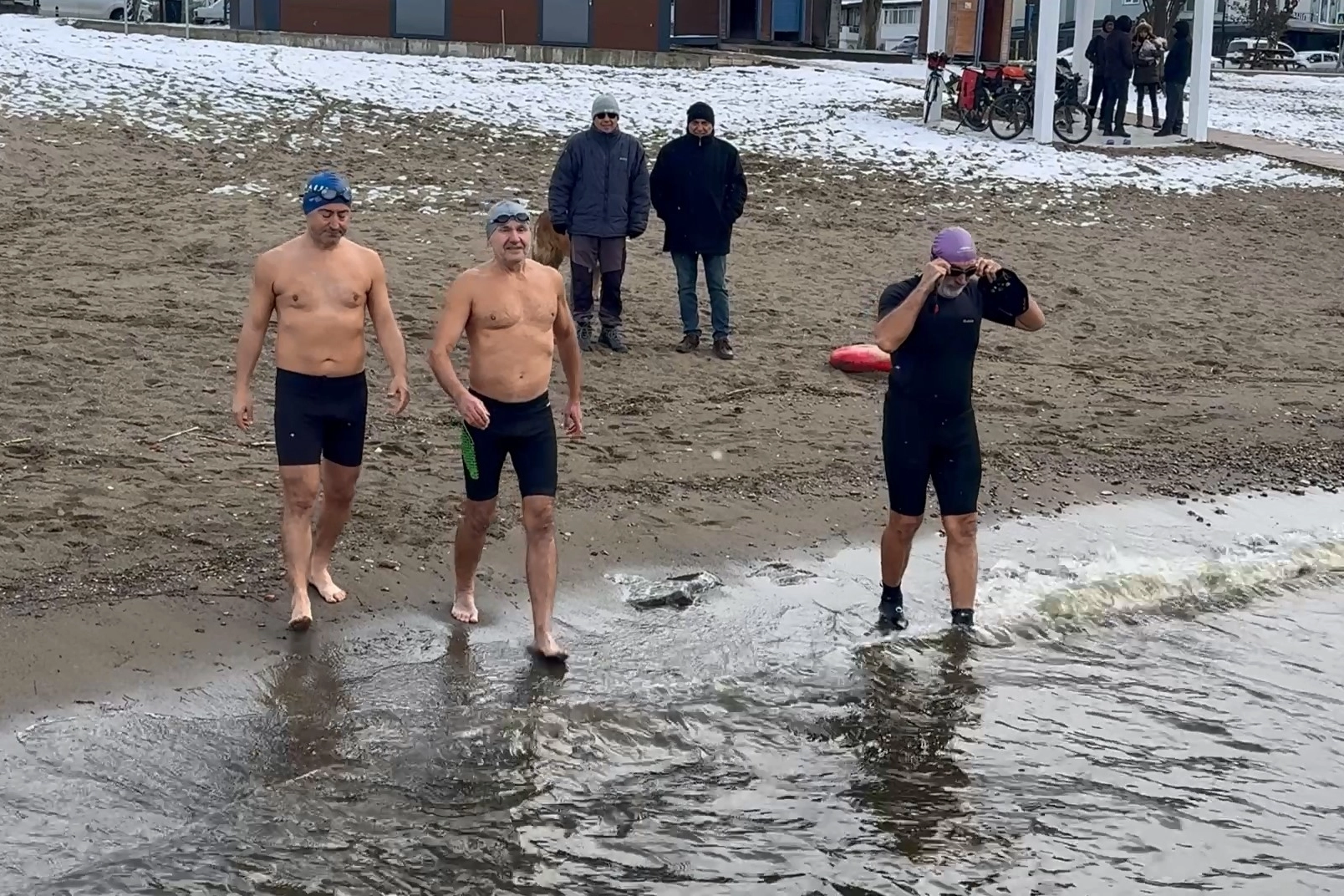 İznik'te kendilerine 'İnciraltı Senatörleri' adını veren 6 kişiden oluşan bir grup, kar yağışı ve soğuk havaya aldırış etmeden göle girip yüzdü.