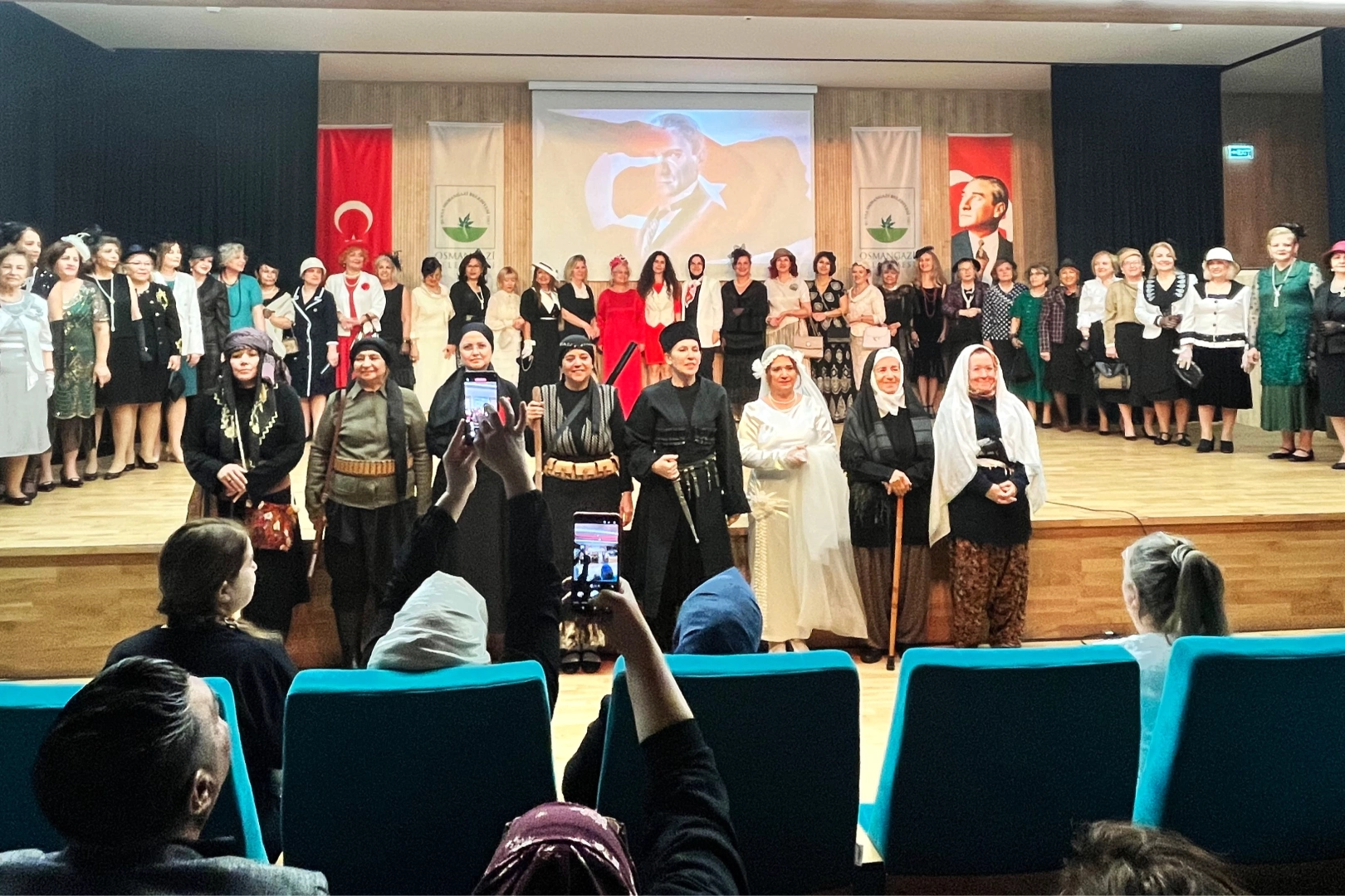 Kutlama etkinliğinin sonunda Nilüfer Kadın Korosu Derneği Üyelerinin düzenlediği Cumhuriyet Kadınları Defilesi izleyenlerden tam not aldı.