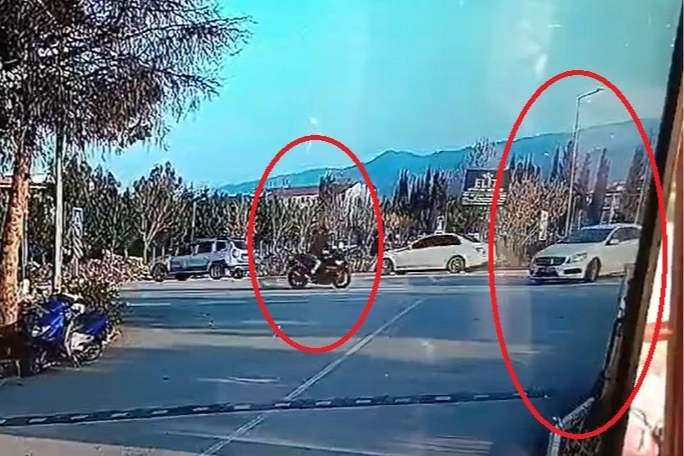Kadın sürücünün kullandığı Mercedes'e sağ kapı kısmından çarpan Baştürk'ün başındaki kask sitenin girişine doğru metrelerce yuvarlandı.