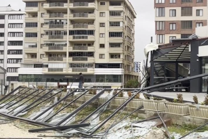 Edinilen bilgiye göre, Çiftehavuzlar Mahallesi'ndeki 3 katlı bir apartmanın alüminyum çatısı fırtınada koparak sokağa düştü.