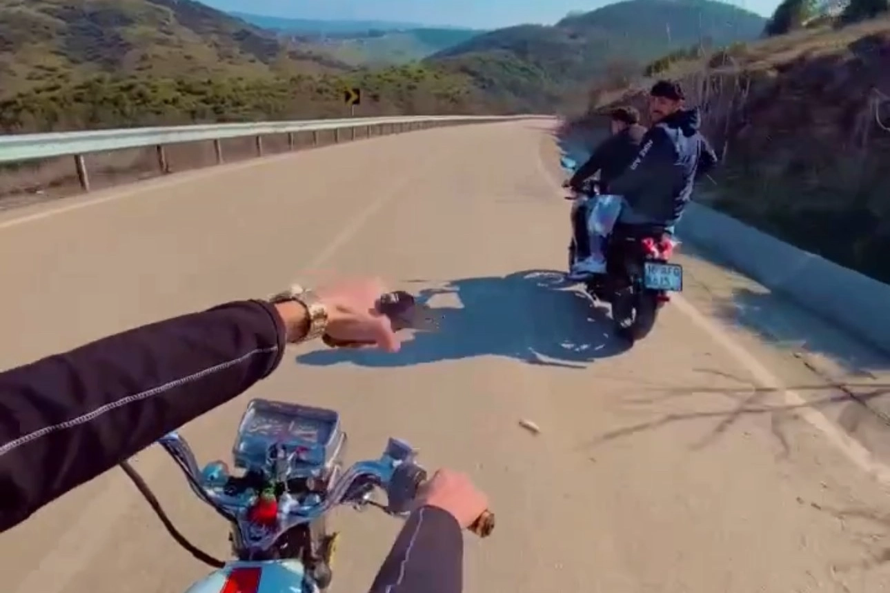 Bursa'da motosikletli gençler eğlencenin dozunu kaçırınca seyir halindeyken birbirlerine kurusıkı tabanca ile ateş ettiler. O anlar cep telefonu kamerasına yansıdı.
