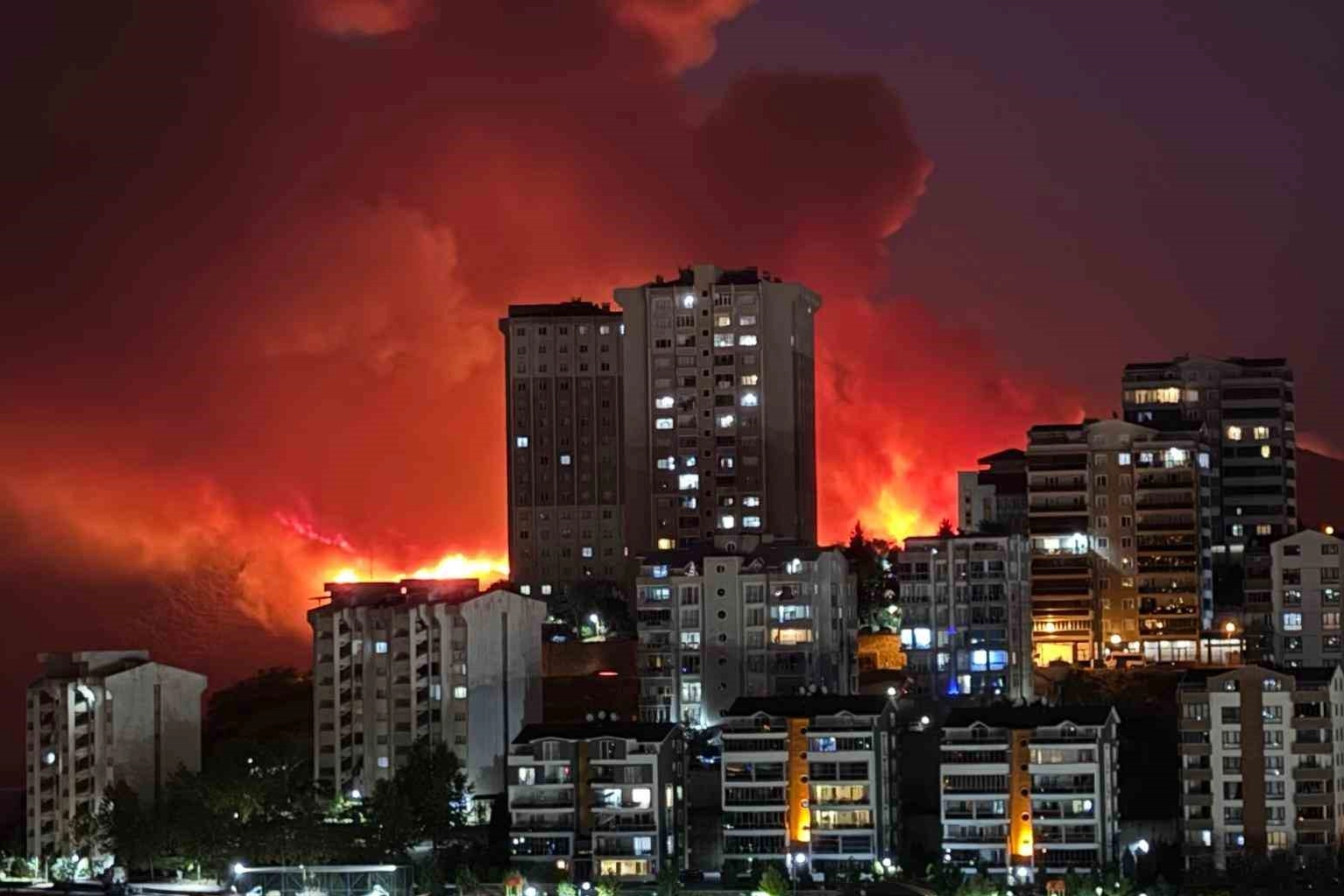 Alevlerin TOKİ bölgesine hızla ilerlediği görülürken gecenin karanlığı yangının alevleriyle aydınlandı. Öte yandan alevler şehrin her tarafından fark ediliyor.