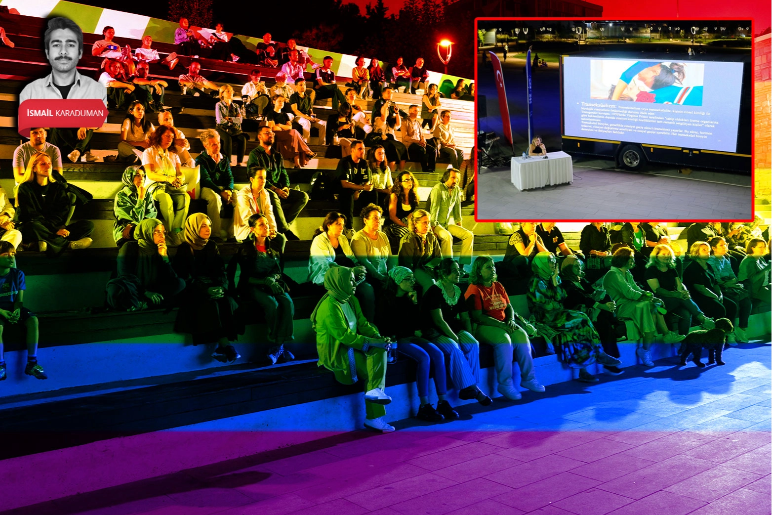 Söyleşide, transseksüellik konusu ele alınırken ekrana transeksüelizm kavramını anlatan slayt yansıtıldı.