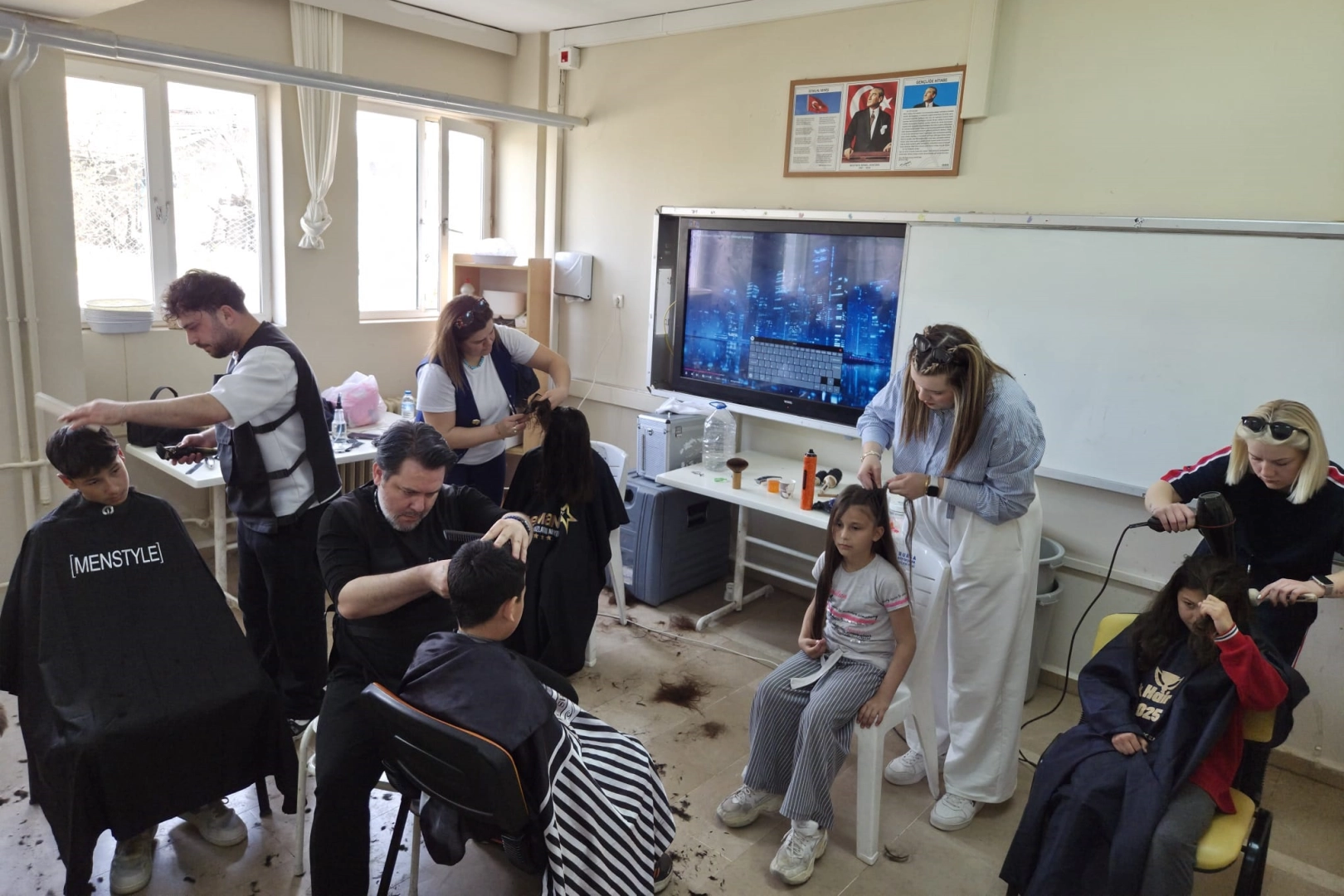 Ziyaret sırasında öğrencilere şampuan ve saç bakım ürünleri gibi hediyeler veren ekip, öğrencilerin saçlarını ücretsiz olarak kesti ve bakım hizmeti sundu. 23 Nisan Ulusal Egemenlik ve Çocuk Bayramı öncesinde çocuklarla bir araya gelmek ve onları mutlu etmek için böyle bir etkinlik düzenlediklerini söyleyen işletme sahibi Kenan Şahin, “Geleceğimiz olan çocukların yüzünde bir tebessüm oluşturmak istedik. Bunda başarılı olabildiysek ne mutlu bize” dedi.