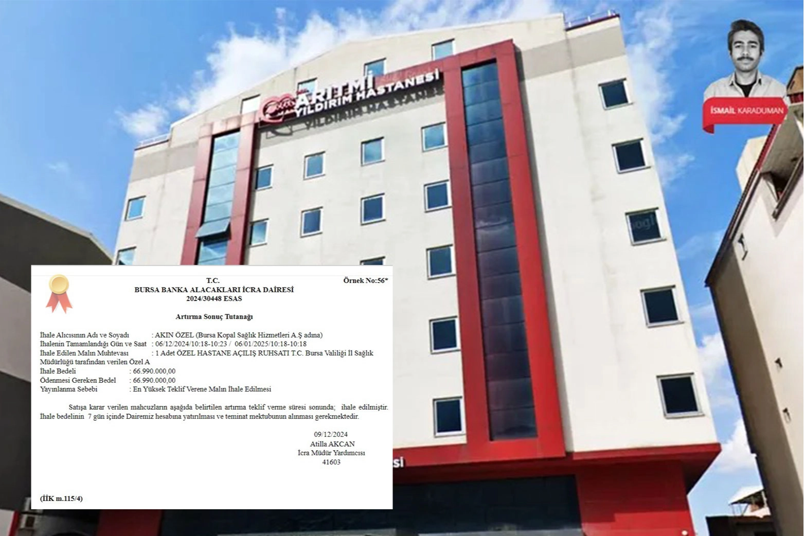 Bursa Banka Alacakları İcra Dairesi de borçların ödenebilmesi için Bursa İl Sağlık Müdürlüğü tarafından verilen hastane ruhsatını açık artırma ile satışa çıkardı.