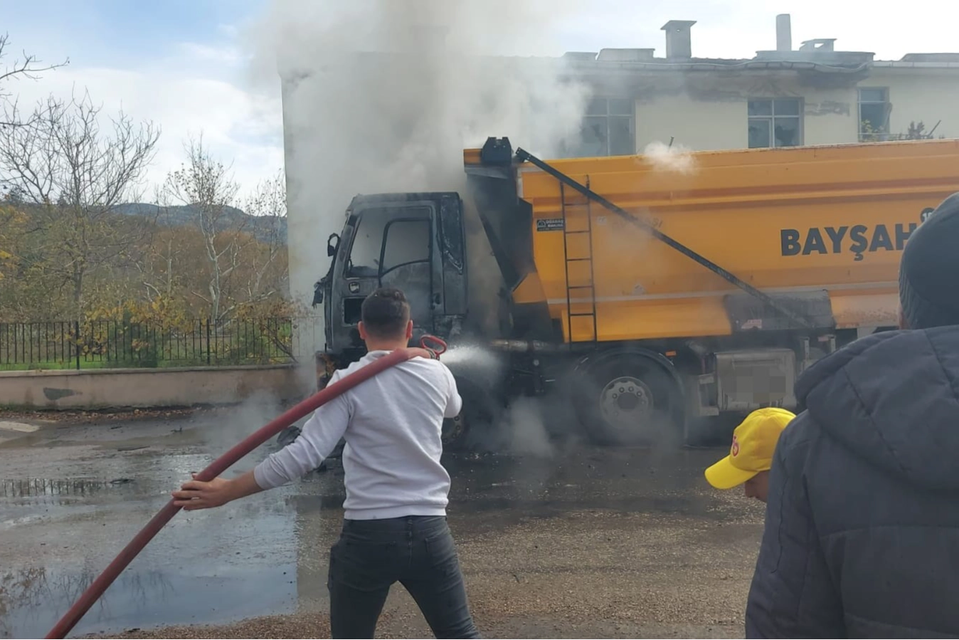 Edinilen bilgiye göre, Taş Mektep yakınlarında hafriyat kamyonundan dumanlar çıktığı fark eden sürücü, araçtan inip canını kurtardı. Biranda alev topuna dönen kamyon, Orman İşletme Müdürlüğü’ne bağlı ekipler tarafından söndürüldü.