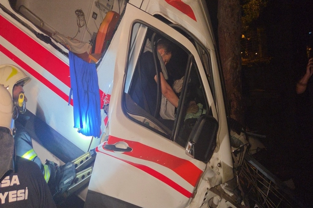 Çarpışmanın etkisiyle kontrolden çıkan ambulans, Orhangazi Belediyesi Fen İşleri Müdürlüğü'ne ait bahçeye düştü.