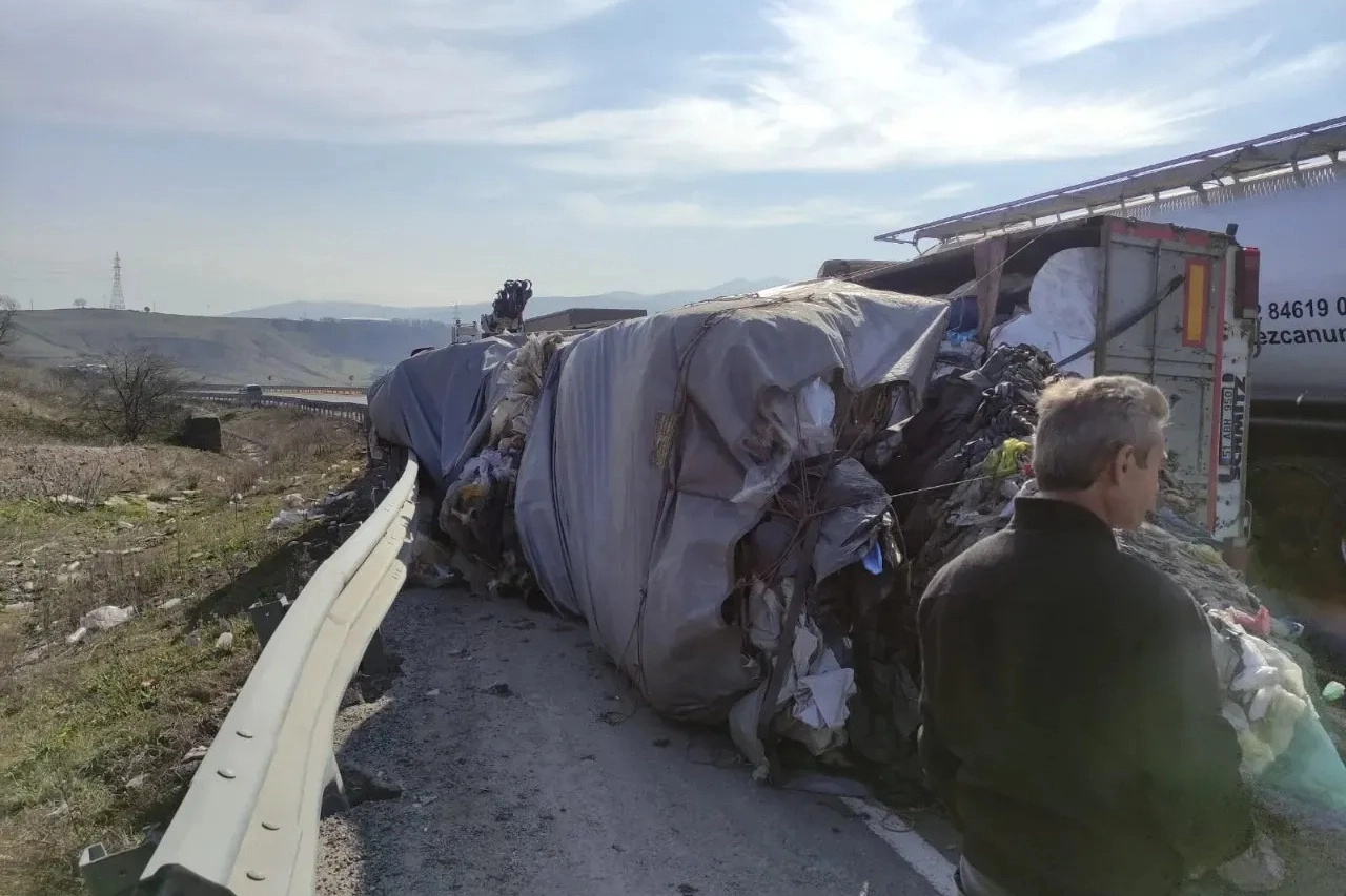Bursa'nın Orhangazi ilçesi yakınlarında, Yalova-Bursa Karayolu'nda meydana gelen trafik kazasında hurda yüklü bir TIR devrildi.