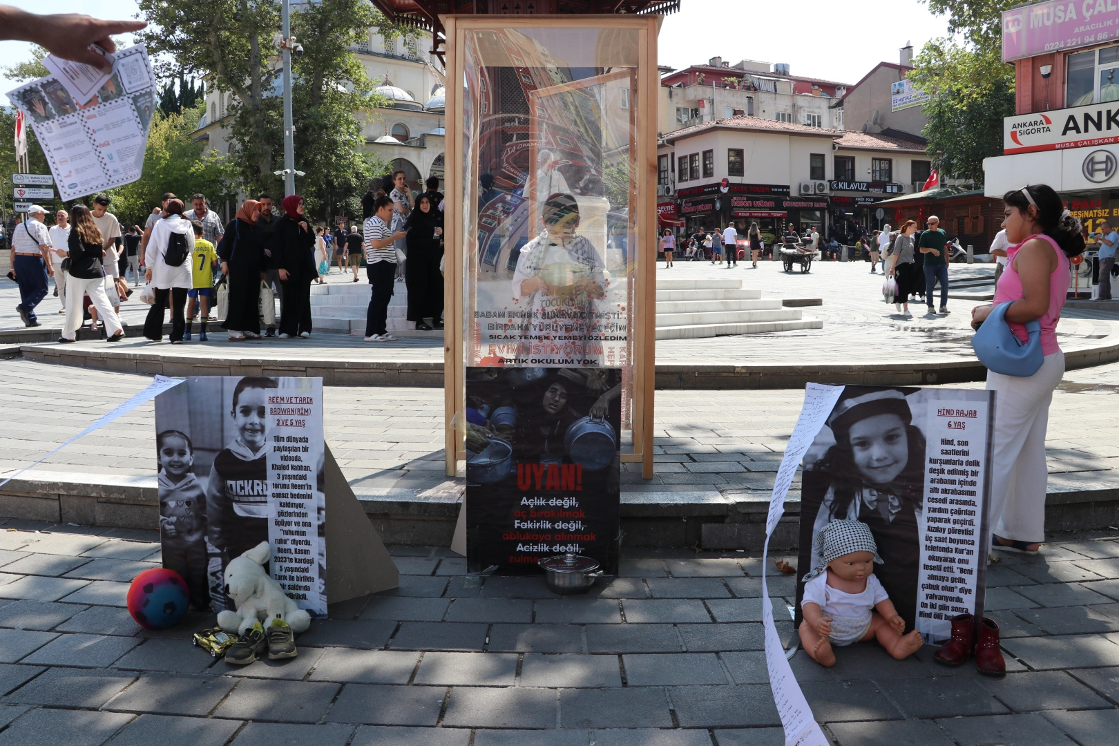 Gazze'de hayatını kaybeden çocukların isimlerini uzun listeler halinde yazan öğrenciler, fotoğraflarla, temsili oyuncaklarla ve pankartlarla yaşananları gözler önüne serdi.