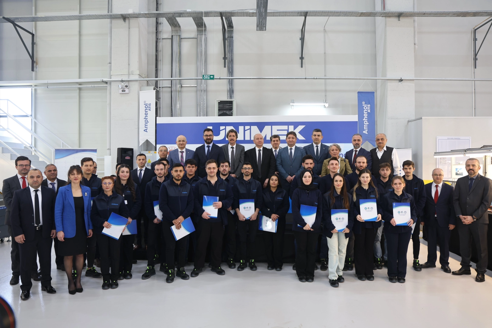 Amphenol Türkiye Interconnect Solutions Bursa Başköy Yerleşkesinde yapılan törene Çalışma ve Sosyal Güvenlik Bakan Yardımcısı Prof. Dr. Lütfihak Alpkan, BUÜ Rektörü Prof. Dr. Ferudun Yılmaz, BUÜ Meslek Yüksekokulları Koordinatörü Prof. Dr. Çağatan Taşkın, OYAÇ MYO Müdürü Doç. Dr. Şekip Esat Hayber, ULUSEM Müdürü Dr. Öğr. Üyesi Şükrü Dokur, BUÜ Genel Sekreteri Mehmet Aydemir, İŞKUR Bursa İl Müdürü Eren Türkmen, SGK İl Müdürü Erhan Karaca, Amphenol Türkiye Interconnect Solutions Operasyon Direktörü Emre Kurtuluş, projede görev alan OYAÇ MYO akademisyenleri katıldı.Törende konuşan Çalışma ve Sosyal Güvenlik Bakan Yardımcısı Prof. Dr. Lütfihak Alpkan, "Bu programlar, üniversite-sanayi iş birliğini tetikleyen ve nitelikli iş gücü ihtiyacının karşılanmasına ciddi katkıda bulunan programlardır. Bu bağlamda Bursa Uludağ Üniversitesinin 50. yılına da denk gelen bu töreni çok önemsiyoruz. Zira üniversitelerimiz, mühendislik ve uygulamalı bilimler alanlarında çok kaliteli öğrenciler yetiştiriyor. Türk iş gücü, diğer ülkelerde üretim yapan iş gücüne kıyasla daha verimli ve daha kaliteli çalışıyor. Bu programdan istifade eden gençlere, kariyerlerinde başarılar diliyorum. Kariyer başarısı aslında bir terfi değil, ortaya konulan işler ve kaliteli projelerdir. Bu katkılarınızın ileride devam etmesi aslında kariyerinizin de yükselmesi anlamına gelecektir. Son olarak, bu programın geliştirilmesine ve yönetilmesine katkı sağlayan İŞKUR merkez ve taşra teşkilatına, Orhangazi Yeniköy Asil Çelik Meslek Yüksekokulu yöneticilerine ve bütün emekçilerimize teşekkür ediyorum" dedi.