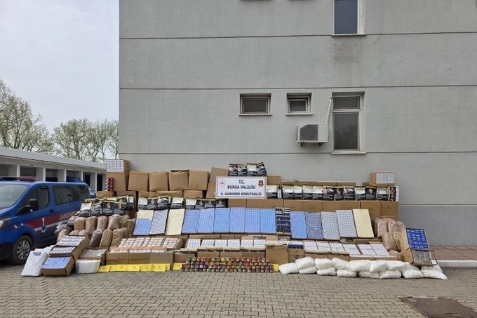Bursa İl Jandarma Komutanlığı KOM Şube Müdürlüğü ekipleri tarafından kaçakçılıkla mücadele kapsamında yürütülen çalışmalar çerçevesinde, şüphelilere ait iş yeri, depo ve araçlarda arama yapıldı. Yapılan aramalarda 1 milyon 186 bin 600 adet bandrolsüz makaron, 920 kilogram açık sarmalık kıyılmış tütün, 200 bin 800 adet sigara filtresi, 92 bin 620 adet makarona basılmış sigara, 19 bin 800 adet şeffaf naylon sigara poşeti, 18 bin 750 adet boş sigara kutusu, 8 bin 780 paket bandrolsüz sigara, 2 bin 700 paket bandrolsüz sigara kağıdı ile 20 kilogram bandrolsüz nargile tütünü ele geçirildi.